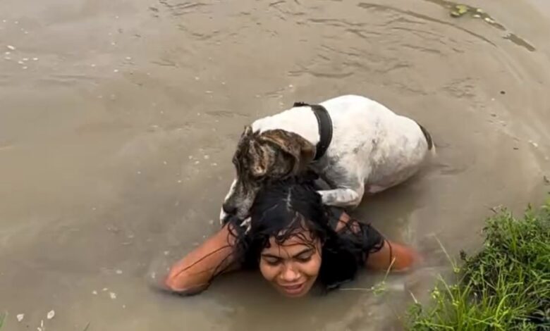 Após o “resgate”, Mila, visivelmente emocionada, abraça o cachorro fora da água. O momento foi marcado por carinho e gratidão.