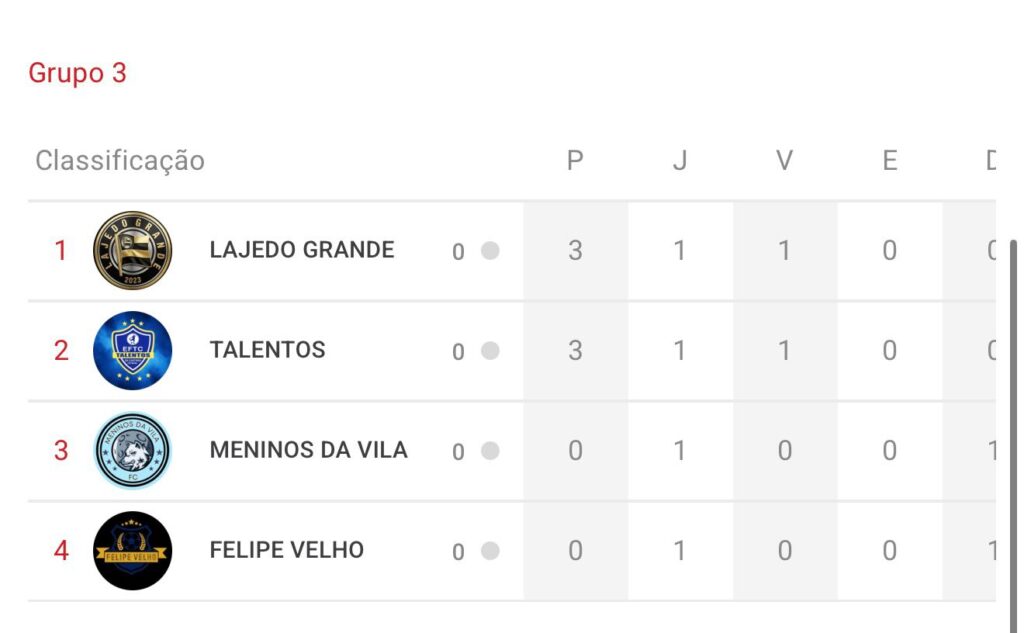 No Grupo 3, Lajedo Grande e Talentos entram em campo em um duelo direto pela liderança. Já Felipe Velho e Meninos da Vila buscam os primeiros pontos no campeonato, o que torna o confronto decisivo para manter chances de classificação.