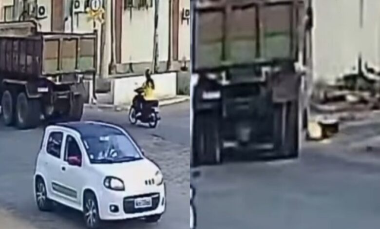 Motociclista escapa por pouco de tragédia ao ser atropelada por caçamba na Bahia